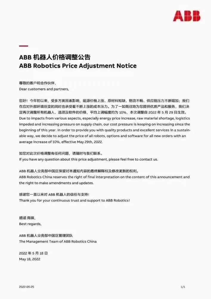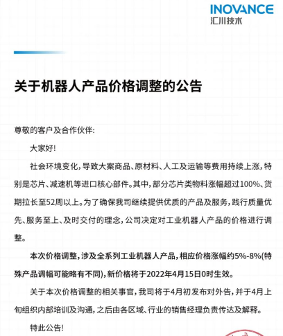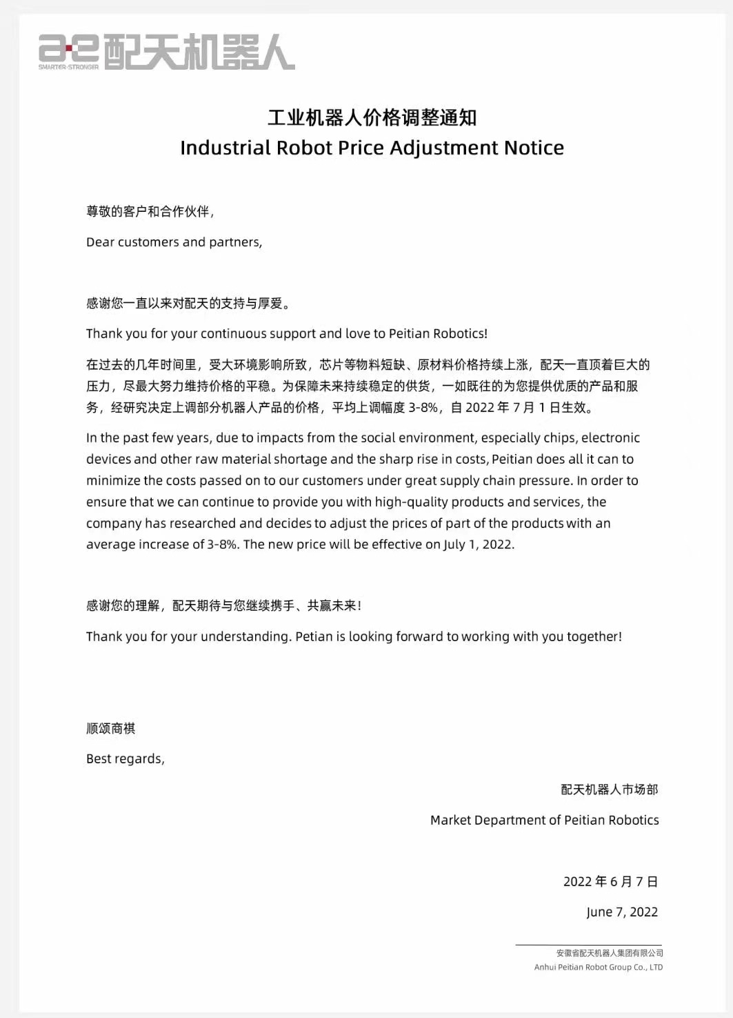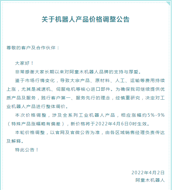 而就在本月,另一家工業機器人企業配天機器人也宣布,自2022年7月1日起,上調部分機器人產品的價格,平均上調幅度3-8%。