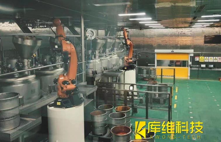 反應(yīng)釜具有精準(zhǔn)控溫功能,并在不同的階段調(diào)節(jié)不同的爐溫,炒好之后,再通過管道輸入包裝車間。而包裝環(huán)節(jié)仍然由機(jī)器人進(jìn)行操作,