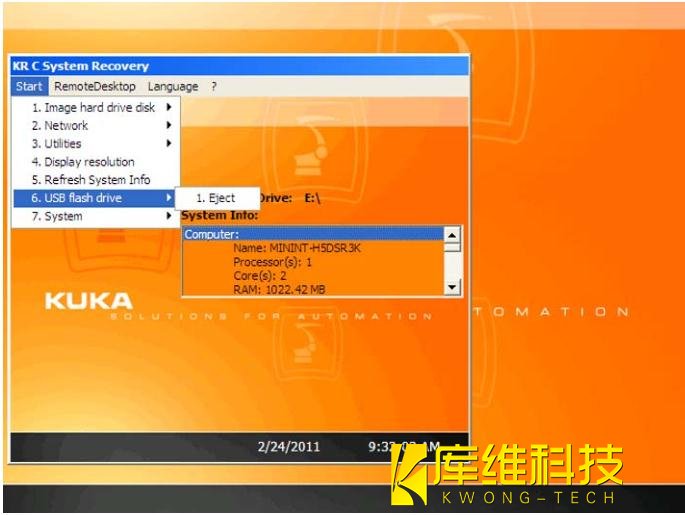 2. 插上具有起動功能的庫卡 U 盤,然后重啟控制系統。