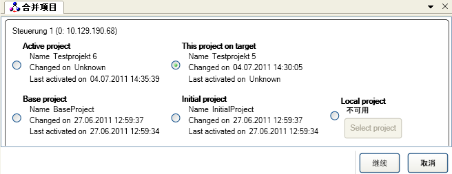 4. 當進度條已填滿且出現狀態顯示 “ 合并準備就緒 ” 時, 點擊 【 顯示區別】鍵。 項目之間的差異即以一覽表的形式顯示出來。若未發現差異,則在信息窗口中顯示與此相關的訊息。 繼續執行第 ?8 步。隨后無需執行后續步驟。