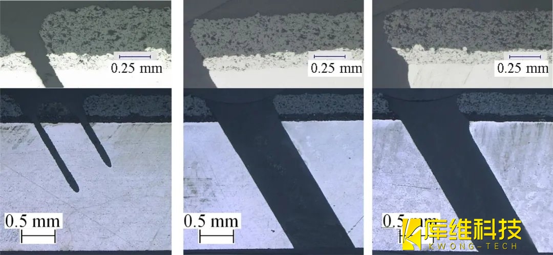 脈沖頻率對水導激光鉆削等量螺旋鉆孔軌道(150條)和平均功率(42 W)的影響如圖5所示。脈沖頻率的增加降低了脈沖能量、峰值功率和功率密度,最終降低了內部產生熱量的程度,從而避免了涂層-襯底界面處的熱點。