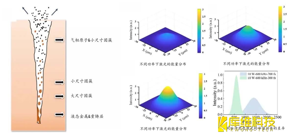 圖中描述了燒蝕金屬靶材的過程中的一系列行為以及展示了不同功率下激光的能量分布和不同脈沖寬度激光的峰值功率的差異。