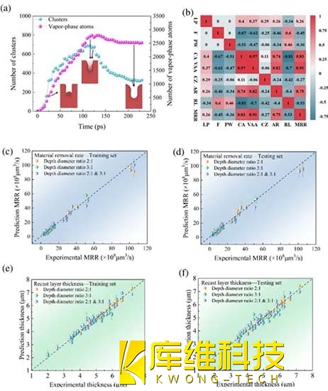 圖中(b)展示了通過分子動力學獲取的參數在皮爾遜相關系數中的結果,LP為激光功率,F為頻率,PW為脈沖寬度,CA為團簇數量,VAA為氣相原子數量,CZ為團簇平均尺寸,AR為燒蝕率,RL為重鑄層厚度,MRR為材料去除率。皮爾遜相關系數表明,絕對值越趨近于1的變量之間相關性越高。設置AR、RL和MRR為加工質量參數,圖中可以看出,CA、VAA與加工質量結果密切相關,證明了MD獲得的物理參數與加工效率和質量具有很高的相關性。圖中(a)為燒蝕羽流中團簇和氣相原子數量隨時間的演化,圖中(c-d)為模型對材料去除率的預測結果,圖中(e-f)為模型對重鑄層厚度的預測結果。