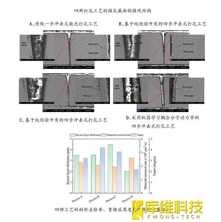 為了驗證機器學習耦合分子動力學模型的有效性,設置了四種工藝。通過對鎳基單晶高溫合金的實驗驗證,四種打孔工藝的微孔截面的微觀結構可以明顯看出,采用機器學習耦合分子動力學的四步沖擊式打孔工藝得到的微孔具有更薄的重鑄層和更小的錐度,驗證了優化工藝的有效性。